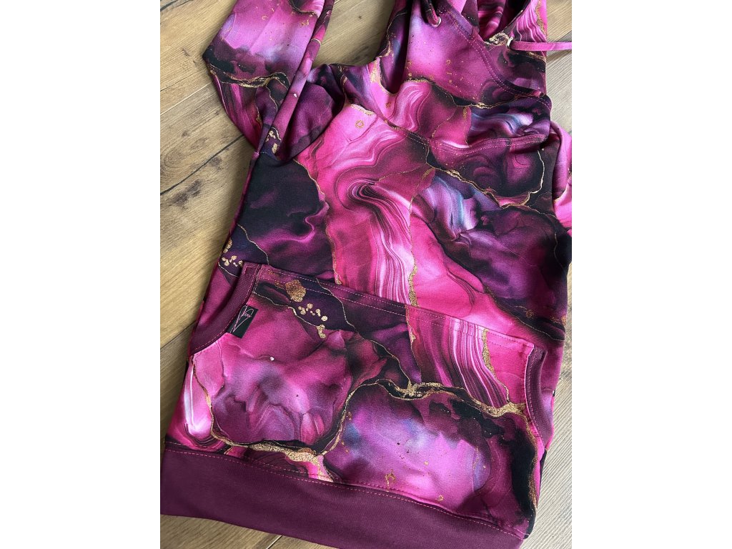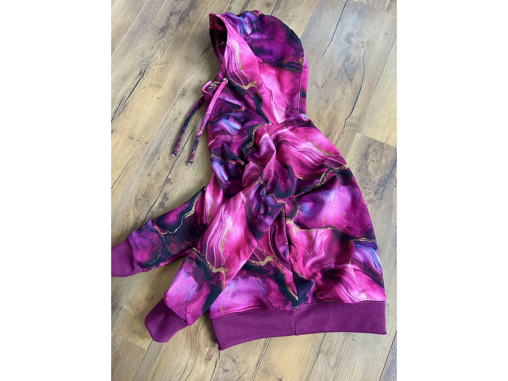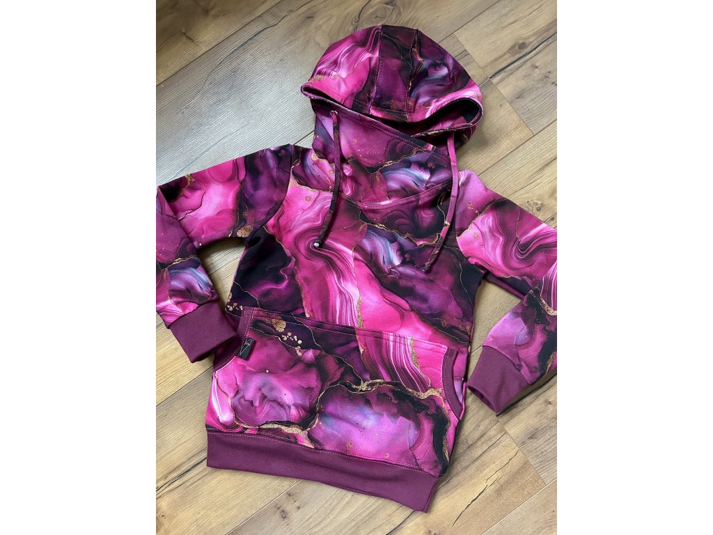 Mikina s překříženou kapucí přes hlavu. V oblasti rukou a pasu ukončeno pružnými náplety.