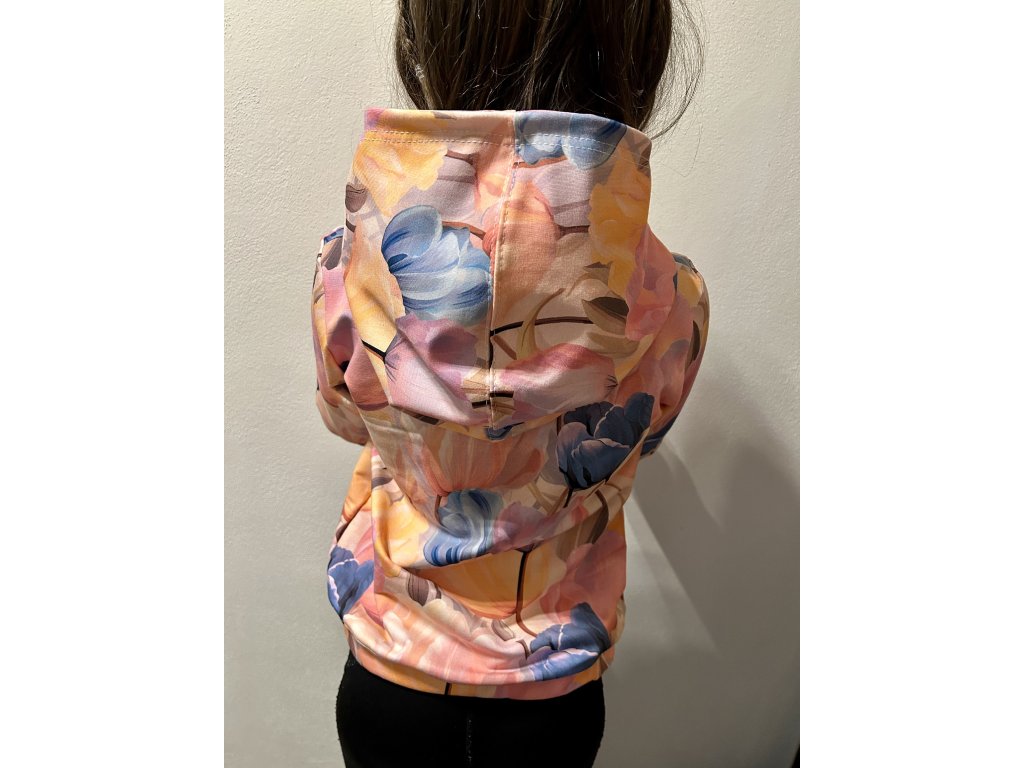 Mikina s překříženou kapucí přes hlavu. Délka do pasu, kde je ukončena všitou gumou.